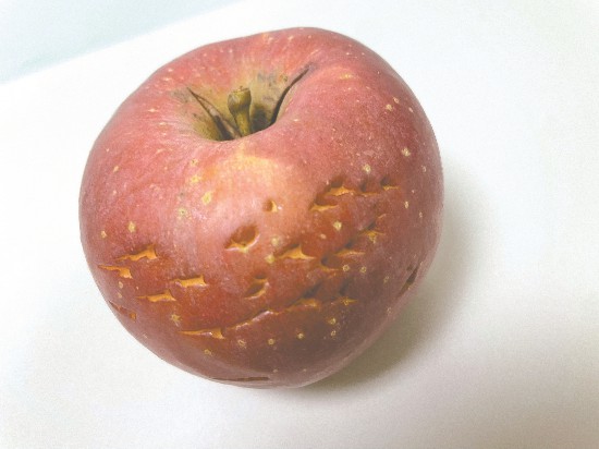 為了更真實地感受大力使用“蘿卜刀”是否會造成傷害,記者找來了蘋果進行刺穿試驗。實驗中記者發現,不論是大“蘿卜刀”還是小“蘿卜刀”,只要是輕輕用力刺蘋果,都能在蘋果表面壓出不小的凹痕。加大用力時,“蘿卜刀”能很輕易地刺進蘋果內部,在蘋果上留下“傷痕”。對比兩把“刀”在蘋果上刺出的痕跡,能明顯看到大的那一把刺出的“傷口”更大更長,而小的那一把刺出的“傷口”更像是一小孔。(成都日報錦觀新聞記者 胡瑰瑋 實習記者 朱馨月 文/圖)