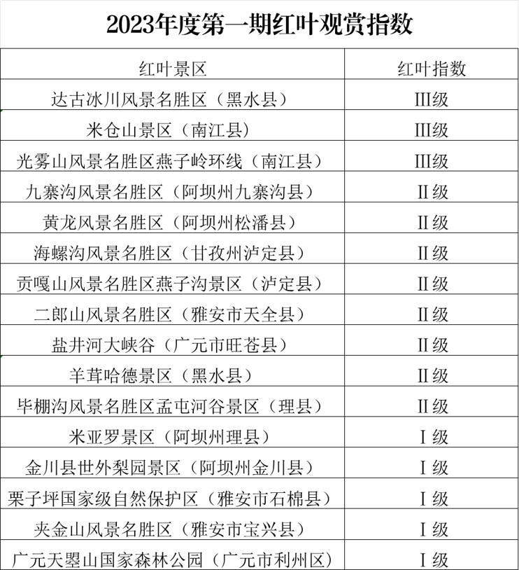 注:根據四川省內各主要紅葉景區所處的地理位置、環境氣候條件以及樹葉變色的程度等,將“紅葉指數”分為Ⅲ級。