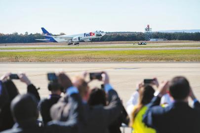 11月8日,運送大熊貓的專機從美國弗吉尼亞州的華盛頓杜勒斯國際機場起飛。 新華社記者 劉杰 攝