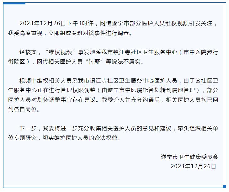 2023年12月26日下午3時許,網傳遂寧市部分醫護人員維權視頻引發關注,我委高度重視,立即組成專班對該事件進行調查。