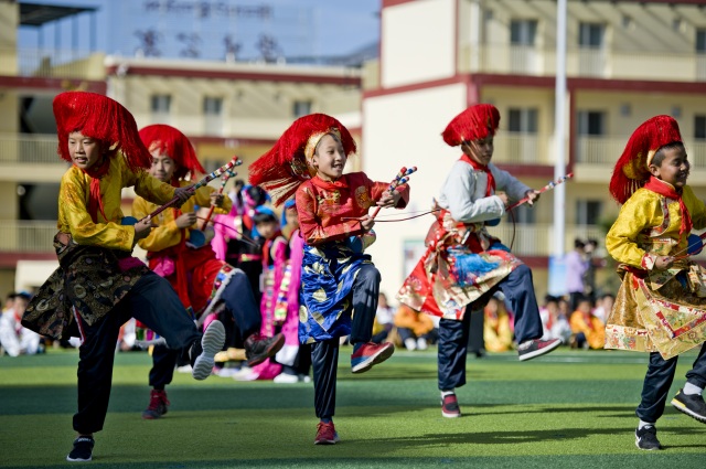 四川甘孜州巴塘縣金弦子小學學生在課間活動中跳起歡快的弦子舞蹈。屈輝攝