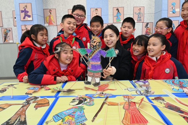 2023年12月19日,在內江市東興區外國語小學,老師正在輔導導學生練習皮影戲表演。蘭自濤攝