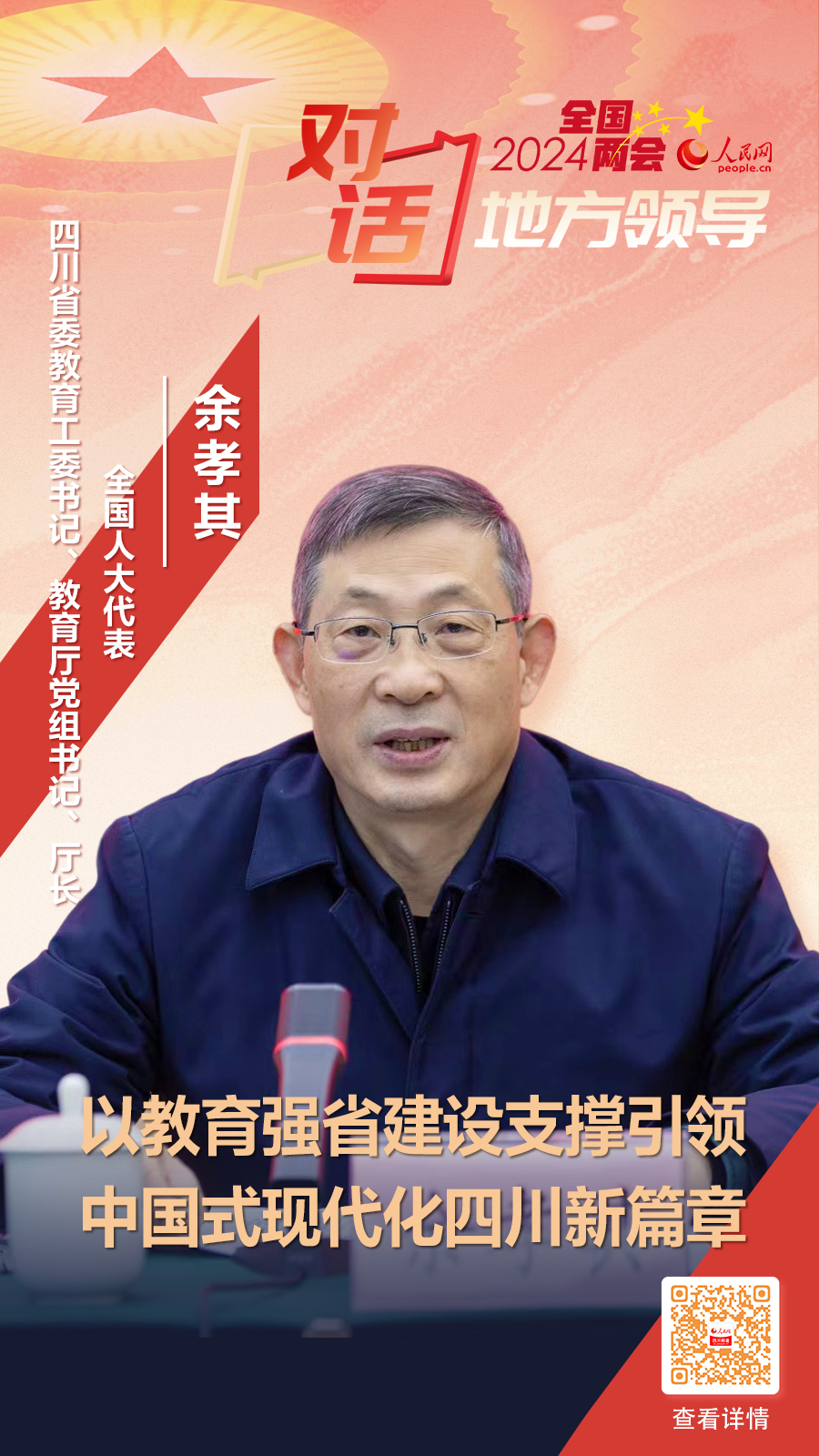 人民網北京3月8日電 (記者李平、王洪江)滿載全國人民的期盼,踏著春天的步伐,近3000名全國人大代表共赴一年一度的盛會。在2024全國兩會召開之際,全國人大代表,四川省委教育工委書記,教育廳黨組書記、廳長余孝其接受了人民網記者專訪。