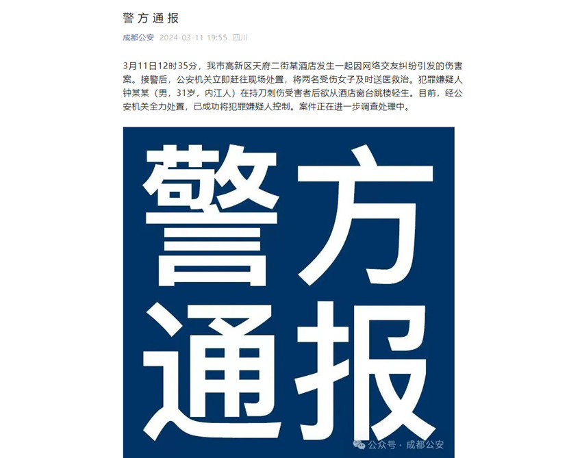 人民網成都3月11日電 (趙祖樂)據成都公安官微消息,3月11日12時35分,成都市高新區天府二街某酒店發生一起因網絡交友糾紛引發的傷害案。接警后,公安機關立即趕往現場處置,將兩名受傷女子及時送醫救治。犯罪嫌疑人鐘某某(男,31歲,內江人)在持刀刺傷受害者后欲從酒店窗臺跳樓輕生。目前,經公安機關全力處置,已成功將犯罪嫌疑人控制。案件正在進一步調查處理中。