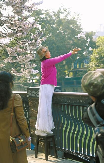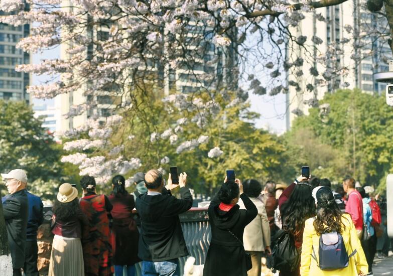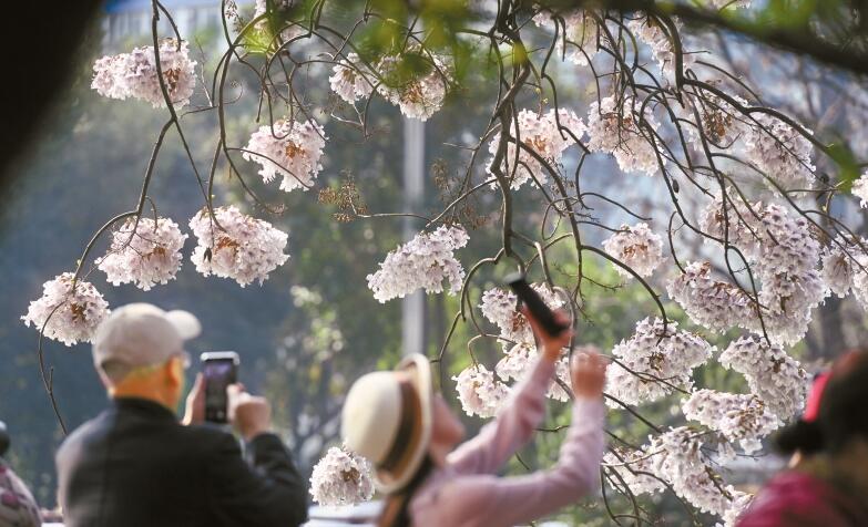 目前,成都市紅星橋的泡桐花進入盛花期,淡紫色的花朵垂滿枝頭。泡桐樹下,拿著相機手機拍花的人絡繹不絕,有人為了“搶占”有利位置,干脆自帶板凳拍美照。(華西都市報-封面新聞記者 雷遠東 攝影報道)