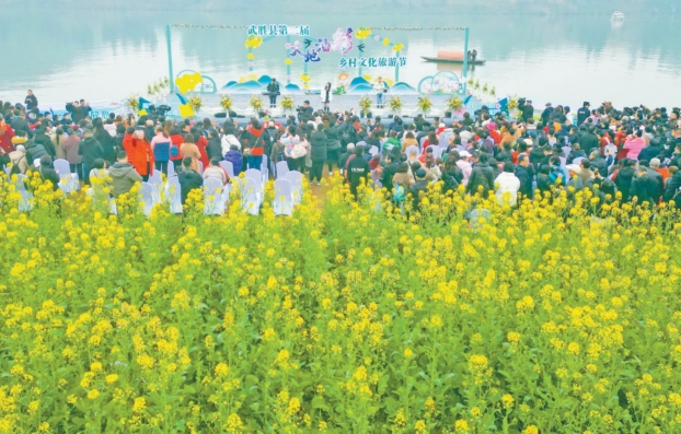 3月8日,武勝縣第二屆大地油彩鄉村文化旅游節在沿口鎮江家壩景區開幕,金燦燦的油菜花吸引了各地游客前來游玩。