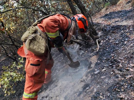 地方撲火隊在火場清理煙點。(甘孜州應急管理局 供圖)