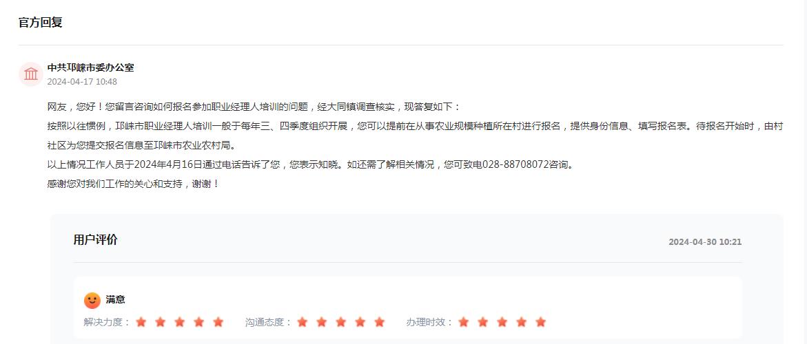 收到留言后,邛崍市委辦公室進行了回復?;貜捅硎?,按照以往慣例,邛崍市職業經理人培訓一般于每年三、四季度組織開展,“您可以提前在從事農業規模種植所在村進行報名,提供身份信息,填寫報名表。待報名開始時,由村社區為您提交報名信息至邛崍市農業農村局”。
