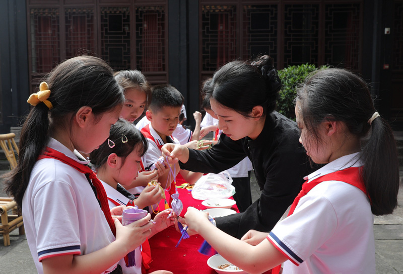 五月五,插艾草,戴香囊。端午節即將來臨之際,瀘州敘永縣中醫醫院帶領敘永實驗小學的學生們,在春秋祠內制作香囊,科普中醫藥文化知識,讓孩子們感受到傳統文化中的本草藥香。