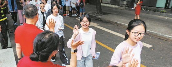 13日,成都市中考正式拉開帷幕。各中考考點組織考生安全、有序、快速進入考點,把好考生入場關。此外,交警、醫護人員也在各考點外待命,做好保障工作。 圖為在棕北中學西區實驗學??键c外,西川中學的送考老師與步入考場的考生擊掌鼓勁。 成都日報錦觀新聞記者 李冬 攝影報道