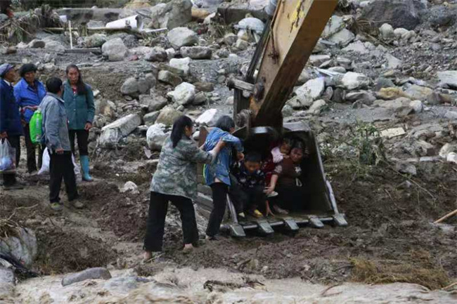 “我們坐在挖斗上時,看到河邊有救援人員不斷向挖掘機駕駛員比手勢,隨著挖掘機動臂和伸臂伸展、收縮、再伸展,我們被平穩地擺渡到河對岸?!?/p>