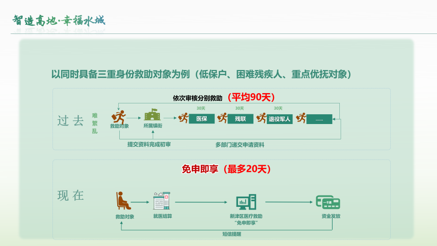 對待弱勢群體的態度體現出一個城市的溫度。作為社會救助的重要組成部分,醫療救助是針對困難群眾治病費用經醫療保險報銷后個人承擔部分的補助,也是防范因病致貧、因病返貧的一項重要兜底政策。成都市新津區依托智慧蓉城建設成果,圍繞申請醫療救助時群眾多頭跑多次跑、資料反復填多次交、審批程序多時間長等難題,積極推動醫療救助跨部門、跨層級業務辦理流程重構,在全國率先建設完成醫療救助“免申即享”,為加快健全社會救助制度、精準快速高效推進救助幫扶提供了新津思路。