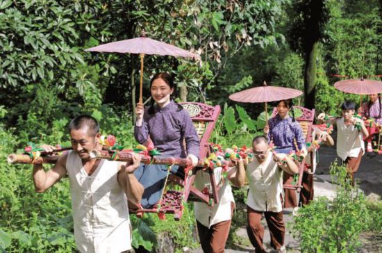 7月24日,華鎣市在溪口鎮黃龍寺至寶鼎段的山路上舉行滑竿抬幺妹比賽,展示國家級非物質文化遺產——華鎣山滑竿抬幺妹的魅力。經過上千年傳承與演變,華鎣山“滑竿抬幺妹”已成為一種民俗文體活動。圖為參賽選手行走在山間小道上。余凡華 華鎣融媒 周松林 攝影報道