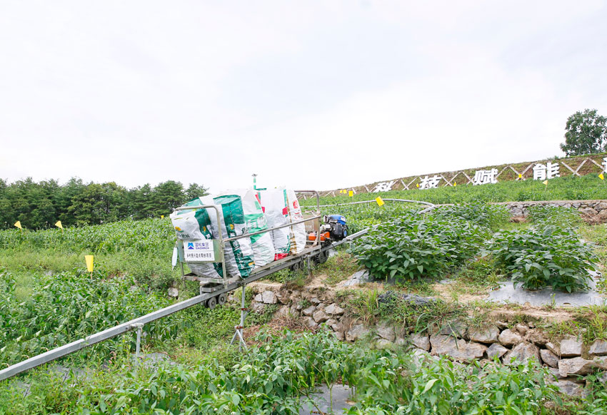 在大片菜地里,一條條單軌順著地形蜿蜒向前,軌道上的運輸車里裝滿了辣椒。發動機一響,小車順著軌道一溜煙地開往目的地。沈萬全說,在曾家山,像這樣的單軌有40多公里,配備有單軌運輸車40多輛。同時,為解決高山水源不足問題,基地里還配備了6處130立方米的軟體水窖,雨季囤水、旱季使用,可有效緩解旱情。