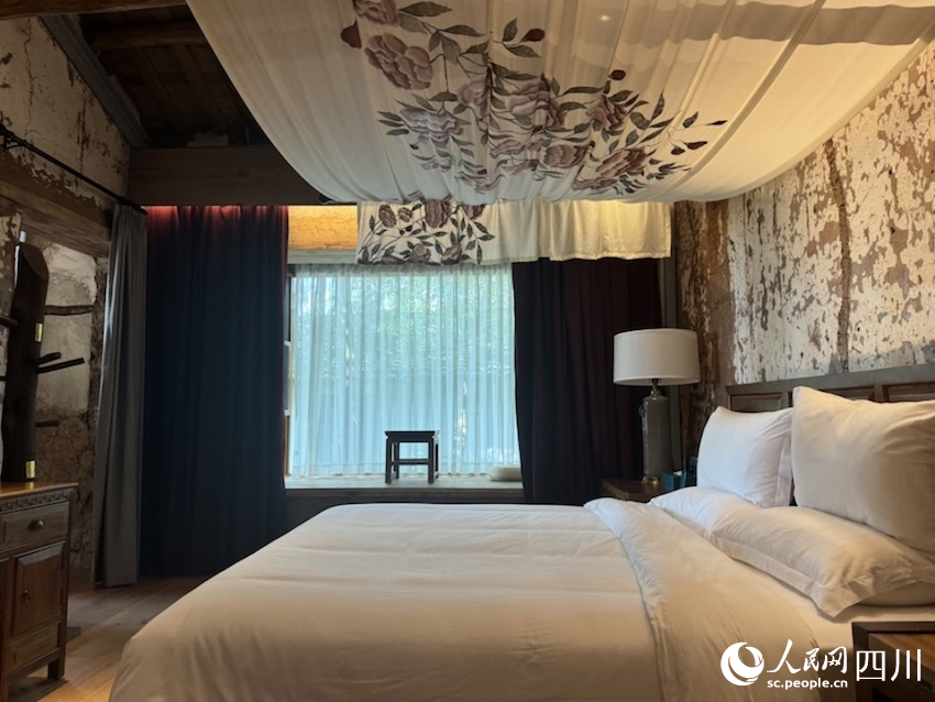 推開油漆斑駁的木門,實木地板、繡花床品、全屋智能設備、私湯泡池……“墻內”的現代舒適,與“墻外”的古樸滄桑形成鮮明對比。如果游客選擇二層小樓,便可在一樓倚窗小酌,二樓憑欄遠眺,將青山綠水、日月霞光盡收眼底。