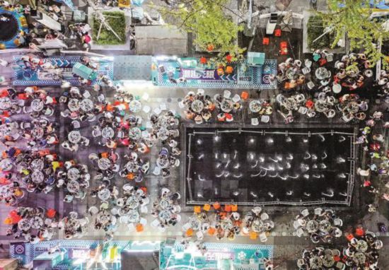 夜幕降臨,華鎣市的不少市民不約而同前往天上街市、華鎣山廣場等夜市,品嘗燒烤、小吃,暢飲啤酒、涼茶,為消費市場注入新的活力。圖為9月4日,市民匯聚在天上街市夜市,盡情享受夜生活的樂趣。