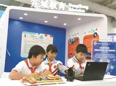 在本屆服貿會的教育專題中,“科學教育”成為關鍵詞。北京青年報記者在服貿會現場了解到,此次教育專題展區中首設中小學科學教育實驗區實驗校建設專區,本市東城、西城、朝陽、海淀、石景山、門頭溝6個入選全國中小學科學實驗區一同參展,同時聯手一大批教育科技企業參展,為如何在教育“雙減”中做好科學教育加法提供“解決方案”。同時,本屆服貿會上科學教育課程方面的創新也是亮點頻現,為科學教育實施提供了豐富的路徑。