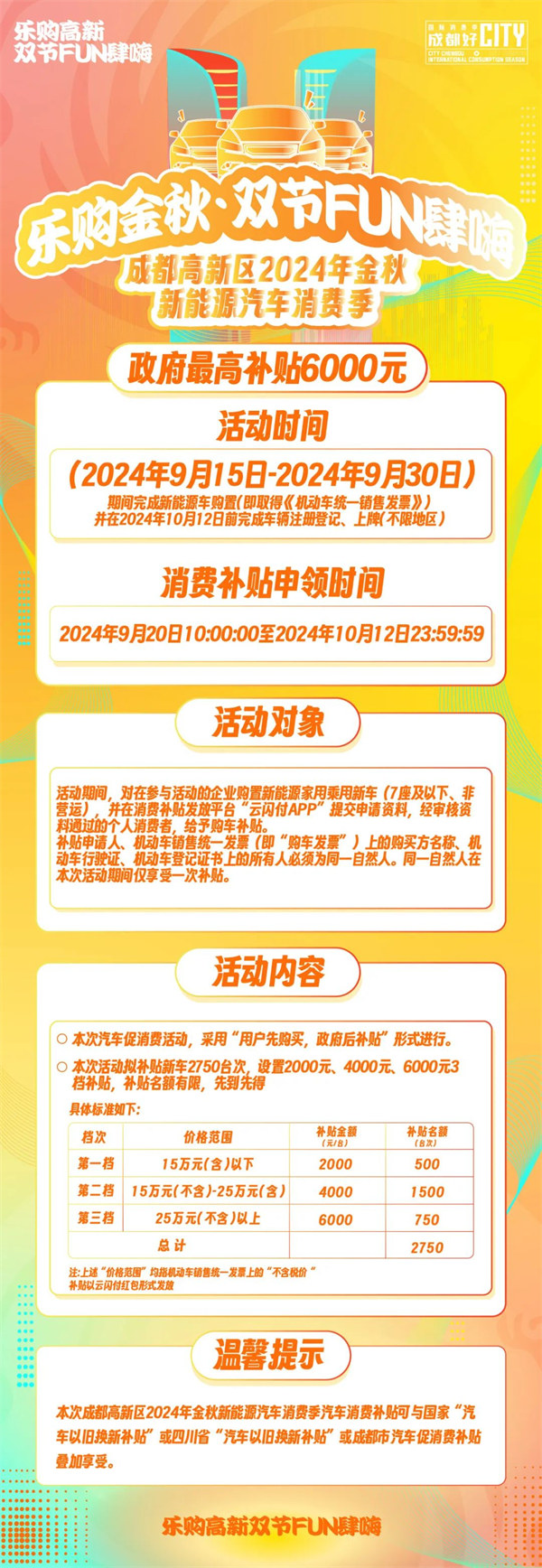 作為“樂購高新·雙節Fun肆嗨”成都高新區金秋消費月的主要活動之一,成都高新區2024年金秋新能源汽車消費季已于日前開啟。2750個名額,最高補貼6000元,先到先得!