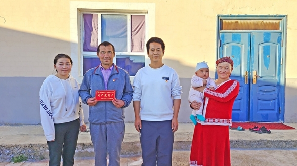 嚴?。ㄗ笕┤霊糇咴L并為共產黨員戶頒發銘牌。 (烏恰縣鐵列克鄉黨委供圖)