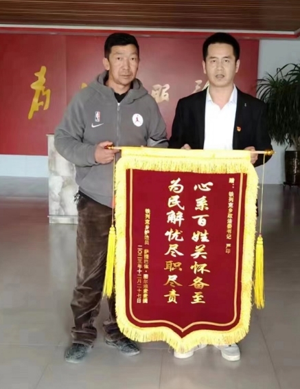 2023年5月,護邊員薩提巴依的妻子患上腦膜炎,需要做開顱手術,急需一大筆錢。嚴印得知情況后,二話不說掏出2000元,交到薩提巴依手中。又發動“互助小組”捐款,幫助薩提巴依一家渡過難關。心懷感激的薩提巴依,為嚴印送來“心系百姓關懷備至,為民解憂盡職盡責”的錦旗。