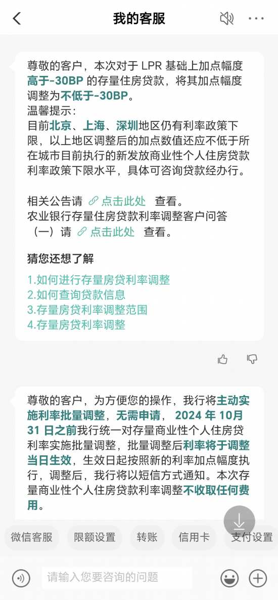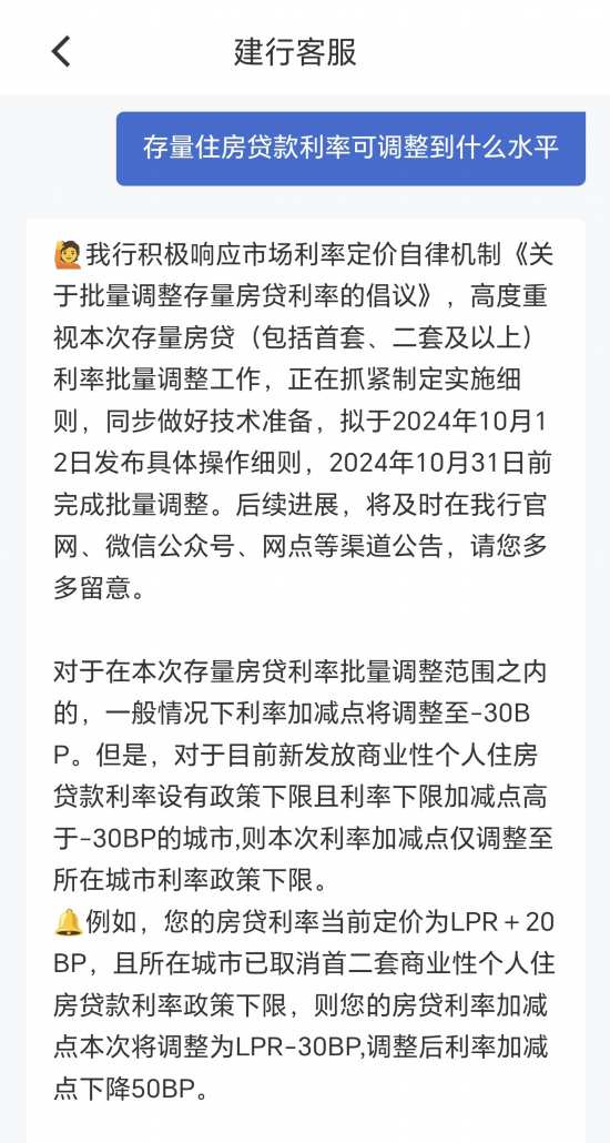 10月10日下午,成都高新區居民薛女士通過工商銀行官方客服熱線咨詢了存量房貸利率調整的相關事宜,并得知一個好消息:2024年10月25日,符合特定條件的存量住房貸款利率將統一調整為不低于貸款市場報價利率(LPR)減30個基點。
