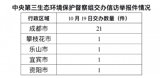 10月19日,中央第三生態環境保護督察組向四川移交第一批群眾信訪舉報件25件(來電舉報25件,來信舉報0件),其中重點關注3件。