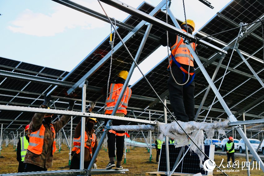 站在海拔4200米建設中的道孚縣亞日“1+N”項目Ⅰ標500MW光伏電站,記者看到,現場的工人們正忙于光伏支架及組件安裝等任務。村民扎西多吉和丁真群措都是現場的安裝工人。接下來他們和其他工人組成的安裝班組每天將要安裝150片光伏板。