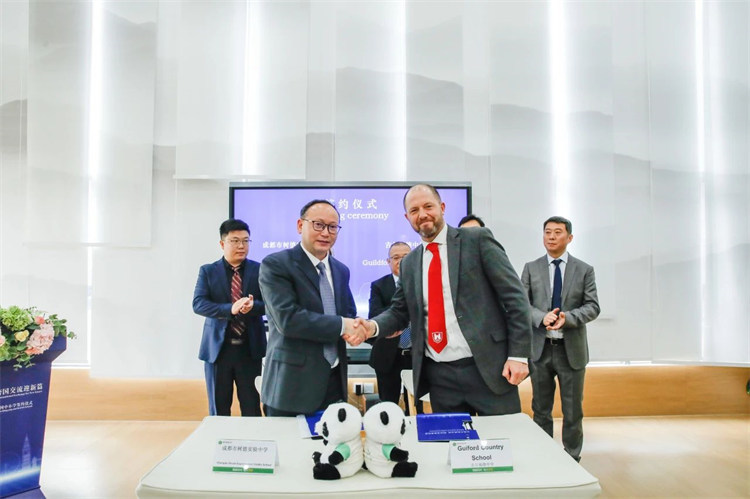 成都市樹德實驗中學與吉爾福德中學Guildford Country School,樹德實驗中學弘毅分校與霍華德·埃芬厄姆學校Howard of Effingham School,石室聯合中學蜀華分校與奧霍利斯中學All Hallows Catholic School,成都市草堂小學西區分校與諾斯米德小學Northmead Junior School,成都市同輝(國際)學校與霍華德·肯寧頓莊園小學Kenyngton Manor Primary School正式簽署了締結國際友好學校協議書,宣告教育合作進入新階段。