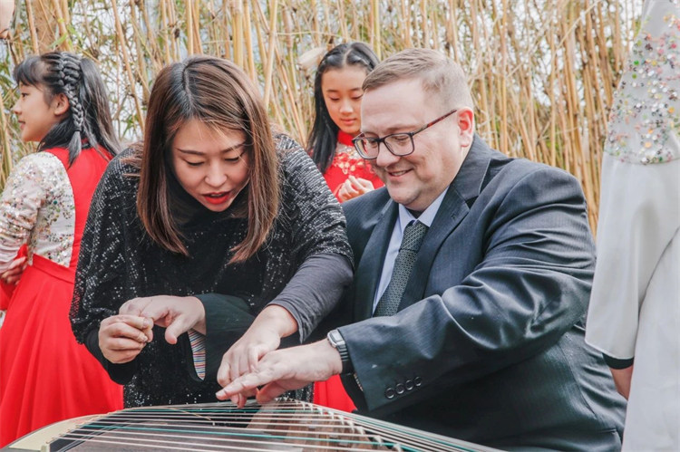 簽約儀式后,來賓們來到空中花園,駐足欣賞同輝學子們帶來的古箏演奏。在古箏程老師和同學們的指導下,來賓躍躍欲試,感受了東方傳統樂器的魅力。
