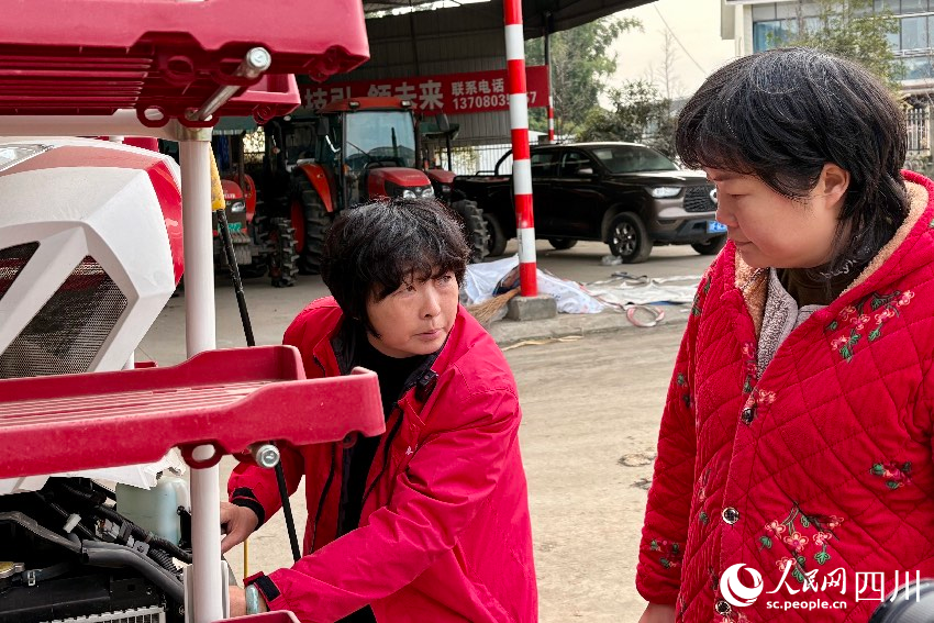 分享農機保養的楊萍(左一)。人民網記者 朱虹攝