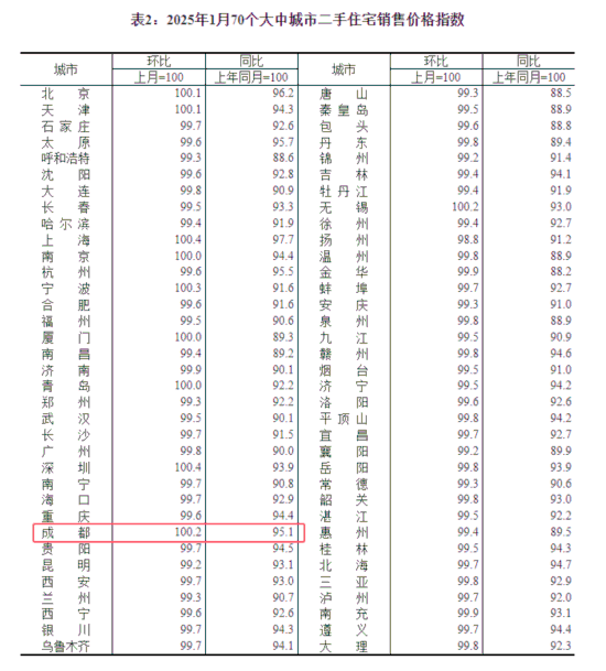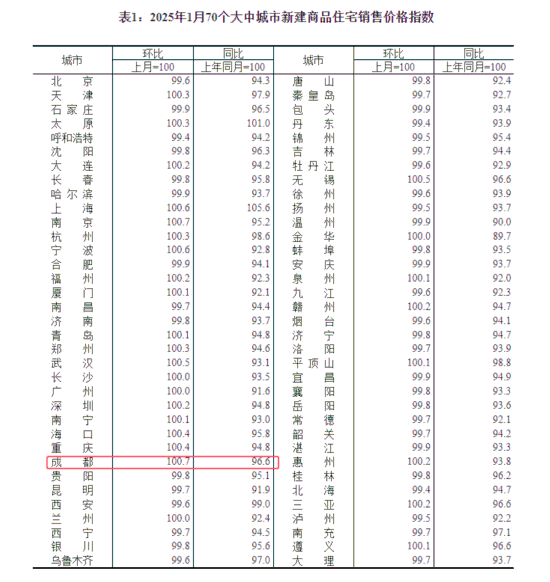 2月19日,國家統計局發布2025年1月份70個大中城市商品住宅銷售價格變動情況,成都新建商品住宅銷售價格指數環比上漲0.7%,與南京并列全國第一;二手住宅銷售價格指數環比上漲0.2%,同樣位居全國前列。