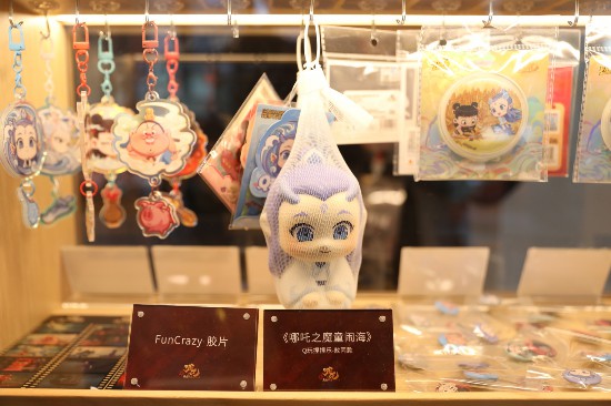 目前,《哪吒2》的相關毛絨玩具、盲盒等周邊產品銷售火爆,一“吒”難求。展覽現場的“IP衍生品展示區”也十分受歡迎,幾十個品種琳瑯滿目,包括鑰匙扣、Q玩捏捏樂、徽章等。工作人員介紹,目前一些款式正在預售,更多衍生品在進一步開發制作中。