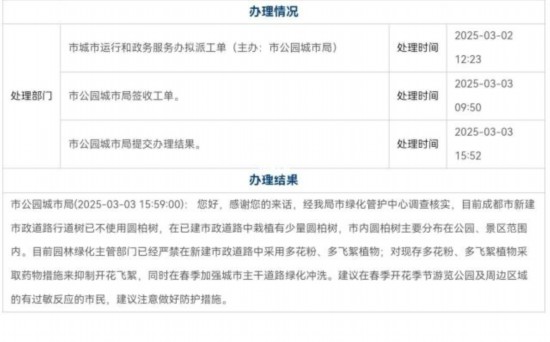 記者查閱主管部門的回應發現,在2月27日,針對網友反映的“圓柏花粉過敏”等問題,成都公園城市建設管理局回應稱:經成都市綠化管護中心核實,圓柏木在本市栽植很少,且已逐漸不用于綠化栽植樹種。目前園林主管部門對已栽植的該樹種近幾年均采取藥物措施來抑制樹木開花,以減少花粉和飄絮。在新的城市綠化規劃時,也已經不再使用這類樹種。同時,在春季開花季節,提醒有過敏反應的市民注意做好防護措施。