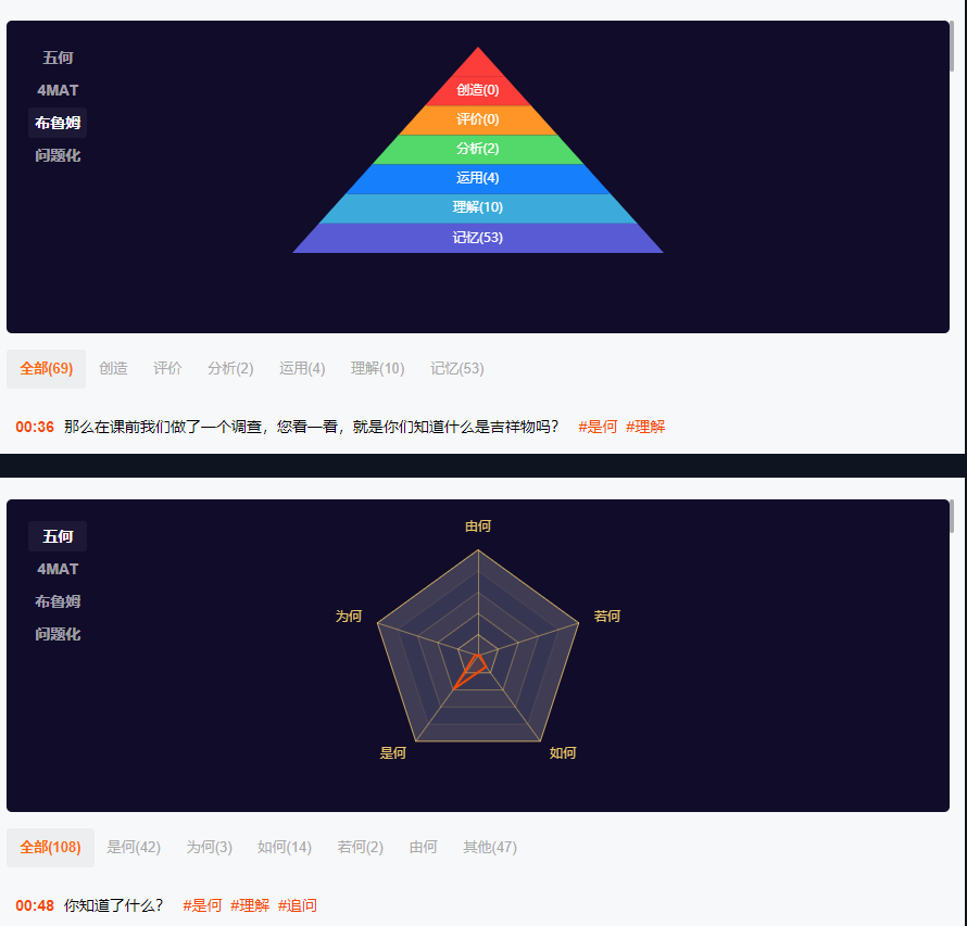 在教師引導數據方面,以“五何”“4MAT”“布魯姆”“問題化”四類模型對教師問題進行精準分析,助力教師提升提出高階問題的能力,從而有效提升學生思維能力。