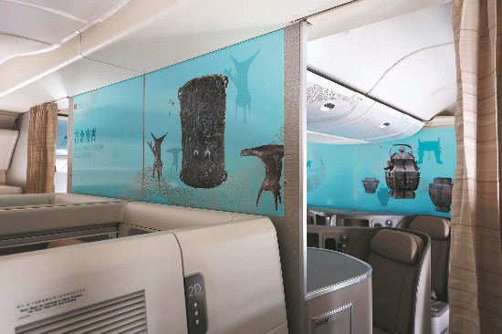 客機機艙內部,在行李架、小桌板、座椅頭墊等位置甄選呈現了30余件上博館藏青銅器的圖案,并配有文物說明和特色紋飾。