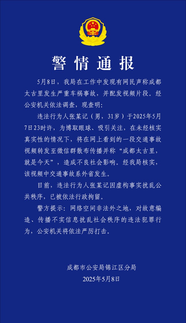人民網成都5月9日電 (記者李平)5月8日,成都市公安局錦江區分局就“網民聲稱成都太古里發生嚴重車禍事故”一事發布警情通報,具體如下: