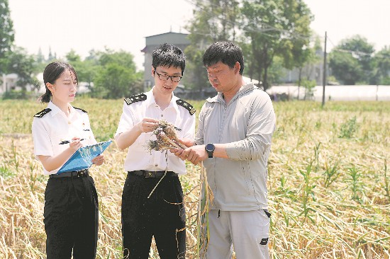 ?、鄯N植基地現場,成都海關工作人員正忙著對即將出口的大蒜進行業務指導。