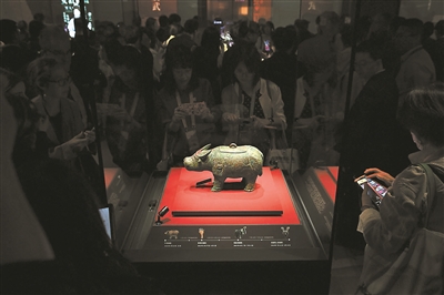 值得注意的是,展覽還有一些限時“出差”的展品,其中占據展廳“C位”的就是殷墟出土的珍貴文物——亞長牛尊。據悉,牛尊的展陳時間僅一周,為5月19日至5月25日。之后的5月27日至6月5日展陳文物為青銅手,6月17日至7月13日展陳文物為銅象尊,7月21日至8月24日展陳文物為孤品雙面銅人像。展柜在這些限時展陳的文物之外,將由首博的備用文物接替“上崗”,想要參觀特定展品的觀眾請注意展陳時間,以免跑空。