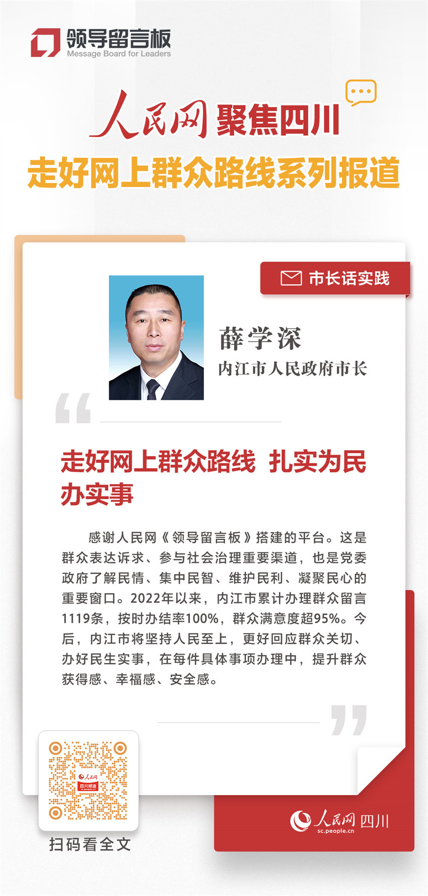 感謝人民網“領導留言板”搭建的平臺。這是群眾表達訴求、參與社會治理重要渠道,也是黨委政府了解民情、集中民智、維護民利、凝聚民心的重要窗口。2022年以來,內江市累計辦理群眾留言1119條,按時辦結率100%,群眾滿意度超95%。