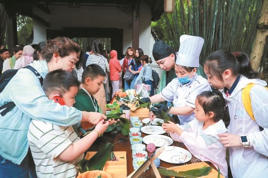 五芳齋、趙粽子的非遺傳承人還在現場展示粽子制作技藝,并邀請游客一起動手體驗。折漏斗、舀糯米、纏粽線……在工作人員的耐心指導下,無論老少都興致勃勃地學習起來,現場歡聲笑語不斷?!拔覍W會包‘錐形粽’啦!回家可以教爺爺奶奶,以后端午節我們家也能包這種好看的粽子!”小朋友樂樂舉著自己包好的粽子,臉上洋溢著自豪的笑容。市民李女士帶著孩子前來,她感慨道:“這不僅是美食展示,更是一場文化盛宴,孩子看得入迷,我也了解了不少非遺美食背后的故事?!?/p>
