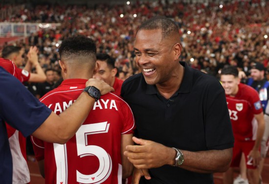 6月5日,印度尼西亞隊主教練克魯伊維特(右)在賽后慶祝。新華社記者 賈浩成 攝