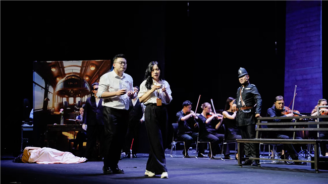突破傳統音樂會框架,在兩位教授的精心指導下,整場演出以“車站月臺”為創意核心舞臺意象。四川文化藝術學院交響樂團以精湛技藝全程現場伴奏,為每一曲目注入鮮活靈魂。燈光流轉間,月臺場景巧妙幻化,將《瑤族舞曲》的歡快靈動、《青春舞曲》的蓬勃朝氣、《等著我,親愛的人》的深情繾綣、《偷撒一滴淚》的細膩詠嘆,乃至《斗牛士之歌》的雄壯豪邁等風格迥異的中外經典曲目,如珍珠般串聯成一部跌宕起伏的“歌劇長卷”。新穎的敘事場景與精心編排的表演,師生動人的演唱與交響樂團默契的配合,讓觀眾仿佛置身時光月臺,親歷一場跨越地域與文化的音樂旅程,耳目一新之際贏得陣陣掌聲。