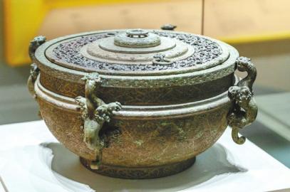 展覽中另一件體現曾國巔峰工藝的代表作是銅鑒缶。這件出土于曾侯丙墓的器物,具有冰酒、溫酒的雙重功能,分兩層,中空部分可放置冰塊,堪稱古代的“冰箱”。