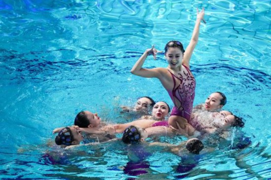 6月15日,中國隊選手在表演秀上。當日,在2025年花樣游泳世界杯總決賽集體技巧自選決賽中,中國隊獲得冠軍。2025年花樣游泳世界杯總決賽在西安落幕。新華社記者 鄒競一/攝