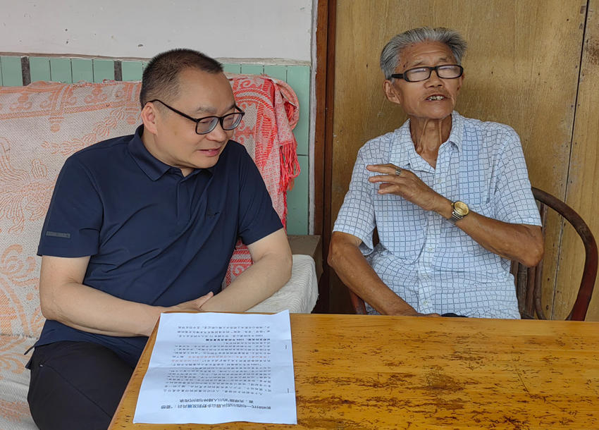黃勁松與徐長華交流,了解當時叫響“要想富,先修路”口號的情況。眉山市黨史和地方志編纂中心供圖