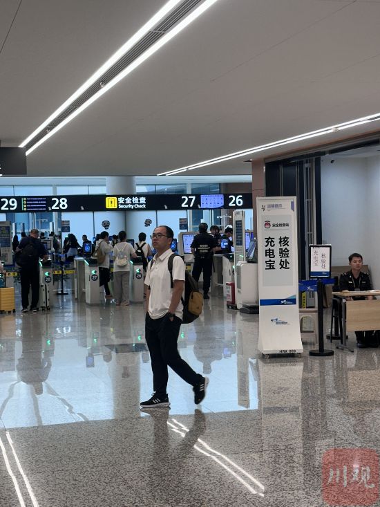 7月21日,記者來到天府機場實地探訪,發現離安檢口大概兩米遠的位置,新設置了充電寶核驗處,充電寶們在這里進行“安檢”?,F場廣播提示:請攜帶充電寶的乘客到充電寶核驗處檢驗,檢驗不合格的可以選擇丟棄,也可以選擇到后方十米處的京東充電寶寄件處進行寄件。