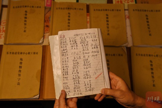 8年前,12月19日,廖素英第一次吃到了免費早餐。當時,她負責打掃棠湖南路二段的清潔,突然來了名餐廳員工叫她,“大姐,到我們餐館去吃早飯嘛,不要錢?!?“騙局?”帶著疑慮,她和工友們走進了泰合素食。一碗熱粥下肚,暖意驅散了冬寒,也融化了陌生。當天,她的名字和邱玉華、盧正美等工友一起,第一次登記在那個樸素的軟面抄本子上。