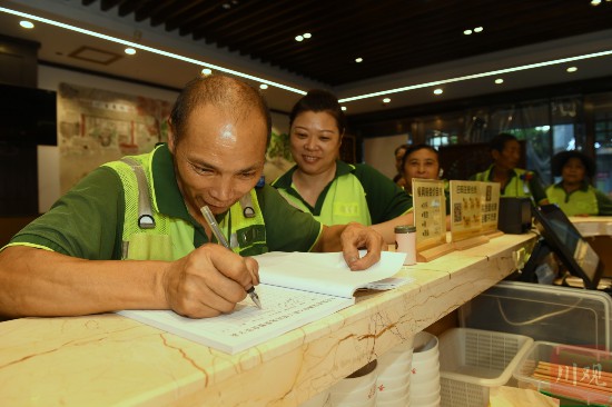 近8年時光,他看見環衛工們的衣著越來越整潔、簽名的字跡越來越漂亮、走進來的神態越來越自若、與普通就餐者間越來越相融、越來越多的個體、私人企業、公共部門參與到公益活動中。這些良性互動,為餐廳積攢了更多的人氣和財氣,讓他們有了底氣將這個公益項目繼續下去。