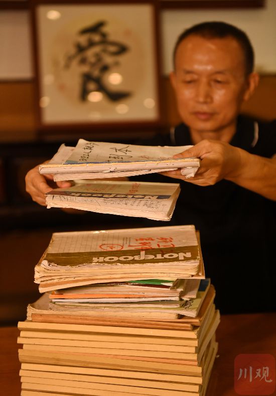 2025年7月30日,在四川省成都市雙流區棠湖西路的泰合素食餐廳,愛心人士王成富整理8年前第一本免費人員吃飯登記冊。川觀新聞記者李向雨 攝影