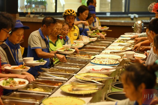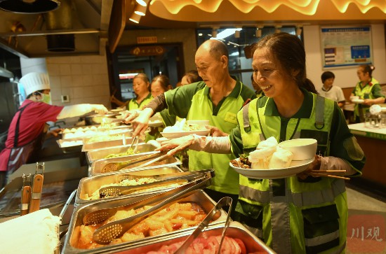 在為這個群眾提供免費餐食的路上,泰合素食餐廳并不孤單。當年,雙流區總工會和城管局在餐廳建起了“環衛工人愛心驛站”。2022年8月,雙流區總工會加大對新就業形態勞動者的關心關愛服務,再次升級打造“工會驛站”、與餐廳合作“工喜食堂”普惠項目。雙流區總工會幫扶中心負責人羅丹介紹,在驛站,不僅有冬暖夏涼的休息室,還有為大腦充電的職工書屋,以及提神醒腦的工喜咖啡。通過普惠合作,一方面,提升了公益力度,將免費早餐擴大到免費早、中、晚餐;另一方面,擴大公益對象范圍,將免費用餐對象從環衛工擴大到了包括快遞員、外賣員、網約車司機、貨車司機等在內的新就業形態勞動者。這里還被全國總工會評為了最美戶外勞動者服務站點。
